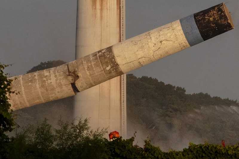 我们看到一辆挖掘机正在爆破这个高达几百米的烟囱,按照工人们的精密计算,这个烟囱应该是往别的方向倒塌,可没想到随着一阵爆破,这个烟囱竟然直直倒向了挖掘机,来听听现场壮观的声音吧,现场马上一片混乱。随即下起了一阵砖头雨,七零八落的砖块很快就把挖掘机的顶部盖得严严实实,由于下落的高度太大,这些砖块甚至把挖掘机的一部分都压塌了。这个倒塌的烟囱,是美国佩尔城历史悠久的烟囱之一,可以追溯到1890年在工厂关闭后进行内爆处理,却不想竟因炸药放置失误,第一次未能引爆成功,第二次却造成了如此庞大的损失。还好有幸运女神的眷顾,挖掘机结结实实的用自己的身躯为挖掘机师傅挡下了这一危难。