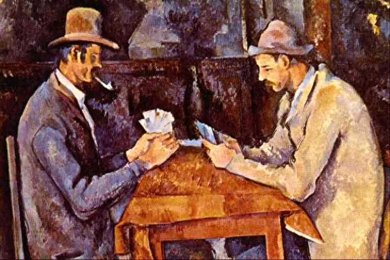 特点和特色:这幅油画采用了塞尚的标志性的艺术风格,展现了他对光影和色彩的独特表现。画中描绘了几个人围坐在桌子旁,其中一位正在玩纸牌,展现出一种休闲而平静的氛围。