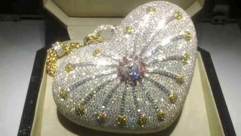 月亮之心钻石手提包是一款由中国珠宝商周大福设计的作品,它由白色金制成,表面镶嵌了12001颗总重508.06克拉的钻石,其中包括一颗总重56.15克拉的心形钻石,作为包包的中心,整个包包呈现出一个月亮的形状,象征着浪漫和幸福。