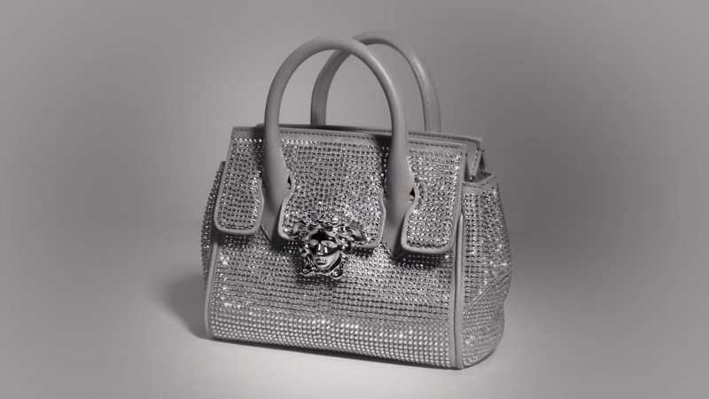 范思哲的标志是一只希腊神话中的美女美杜莎的头像,象征着致命的诱惑。这款三色钻石手提包是范思哲的一款限量版作品,它由黑色鳄鱼皮制成,表面镶嵌了120颗总重10克拉的钻石,分为白色、粉色和黄色三种颜色,形成了一个美丽的彩虹,手柄是由白金制成的,整个包包闪耀着绚丽的光彩。