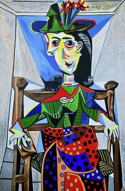 毕加索的晚期作品以描绘一只猫与画作的立体主义形状融合而著称,这是艺术家在他们长达十年的关系中经常描绘的朵拉·玛尔的众多肖像之一。朵拉和毕加索相识时她29岁,他55岁。