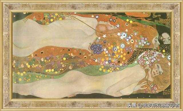 克里姆特的《水蛇二号》,至少画面是美的,只是依旧带着一丝诡异。画中女子仿佛游弋在金箔与花纹之间,交织在一个流光溢彩、变幻流动的梦境里。满幅的金饰、柔美的躯体,几乎没有明确的叙事 —— 但装饰感却达到了极致。