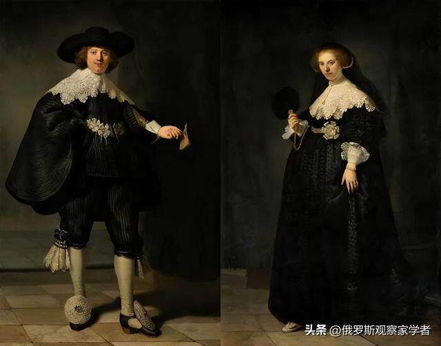画风极为庄重:一身黑衣华服,搭配蕾丝镶边与黄金配饰,这对新婚夫妇摆出标准的肖像姿势。堪称 17 世纪的婚前写真:)