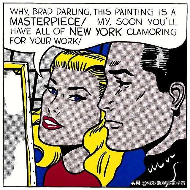 利希滕斯坦的《杰作》,没错,这幅画拍出了 1.65 亿美元!简直就是一张海报!画家恐怕是想借此调侃那些将波普艺术奉为高雅艺术的 “傻瓜”。画中的文字写着:“亲爱的布拉德,这幅画真是杰作!很快全纽约都会为你的作品疯狂!” 这种充满讽刺意味的创作,连画框带内涵,都被艺术市场照单全收。