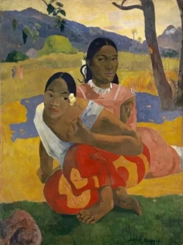 高更以粗犷的轮廓线与平涂的色块剥离了西方的传统透视,赋予画面原始的生命力与神秘感,描绘了两位身着传统服饰的塔希提少女,背景是明亮的热带风光,色彩浓烈而富有象征意味。