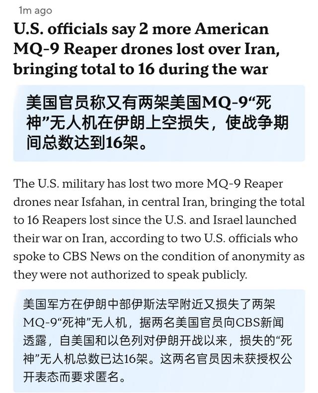 根据<环球网的相关报道,截止到4月1日,美国在对伊朗的军事行动中已经损失了16架MQ-9"死神无人机。初期的报道显示,3月一整个月美军损失数量为14架,后续又有消息证实,美军4月刚开始就在伊斯法罕附近又出现了2架新的损失。至此,总损失数量飙升到了16架。MQ-9无人机的单价超过了3000万美元,意味着美国在MQ-9一个单项上就付出了超过5亿美元的成本。而美国原本指望它们成为“空中利剑”,结果它们却成了最贵的破铜烂铁,实在是很不给力。