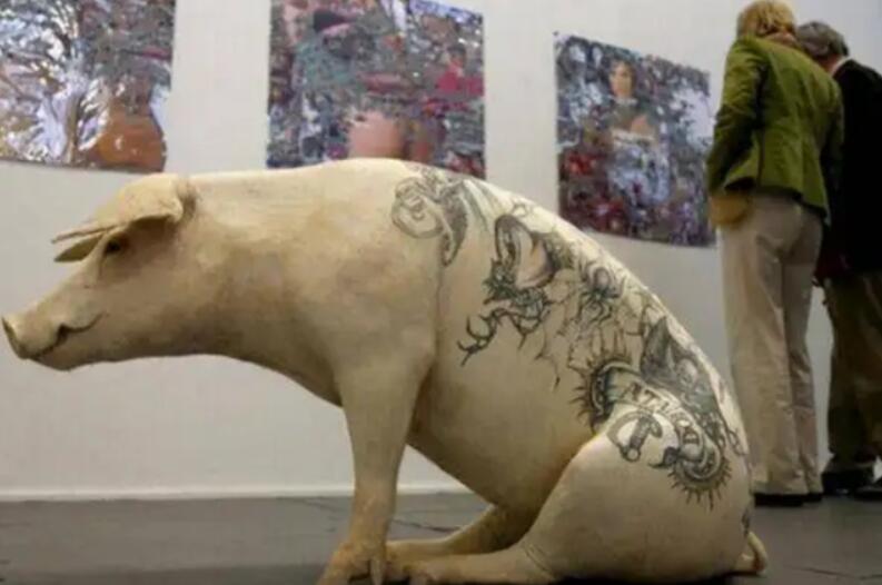 在比利时有一位著名艺术家威姆,其中一件艺术作品就是纹身猪,其猪从欧洲进口并进行专门饲养。这位艺术大师在小猪身上绘制一些东西方风格图案,随着小猪逐渐长大,这些绘制图案自然而然发生变化,猪身上的图案也就越来越有价值。在一些拍卖会上有人出60万人民币买走猪皮纹身。