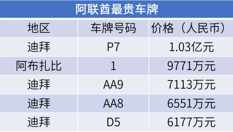 数天前,在迪拜的一场拍卖会上,一位不愿意公开姓名的买家以5500万迪拉姆的价格,拍下了迪拜“P7” 车牌号,按照现在的汇率计算,5500万迪拉姆相当于1.03亿元人民币。1.03亿这一天文数字也刷新了迪尼斯世界记录,成为了目前世界上最贵的车牌。既然是刷新记录,那么之前最贵车牌又是啥呢?