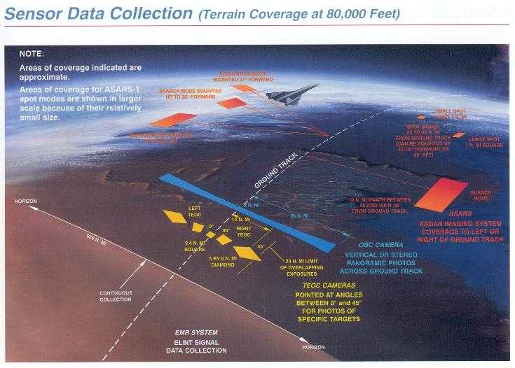 作为一架侦察机,SR-71还搭载了一系列先进的传感器和通信设备,如光学/红外线传感器,电子侦测(ELINT)传感器,雷达,卫星通信系统,UHF无线电通信设备等等。