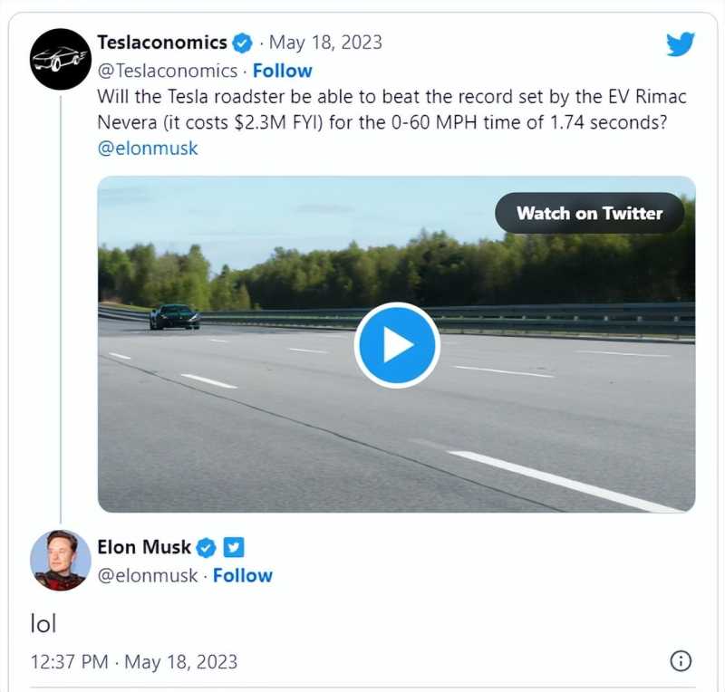 对于Nevera的出色表现,特斯拉CEO埃隆·马斯克只是在推特上回复了一个"呵呵"。