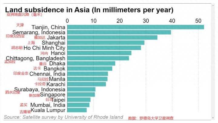 上图就是罗德岛大学科学团队罗列出的亚洲前17位地面沉降最为严重的大城市,我国天津市高居榜首,每年的地面沉降幅度高达52毫米,远高于第二名的印尼雅加达,后者每年的地面沉降幅度只有每年39毫米。而泰国首都每年的地面沉降幅度为17.5毫米,只相当于天津市的1/3。