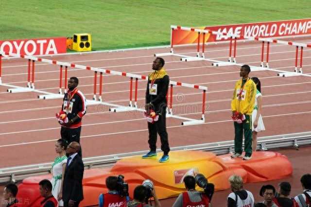 尤塞恩·博尔特在领奖台上赢得了2015年北京国际田联世界锦标赛200米世界冠军Usain Bolt