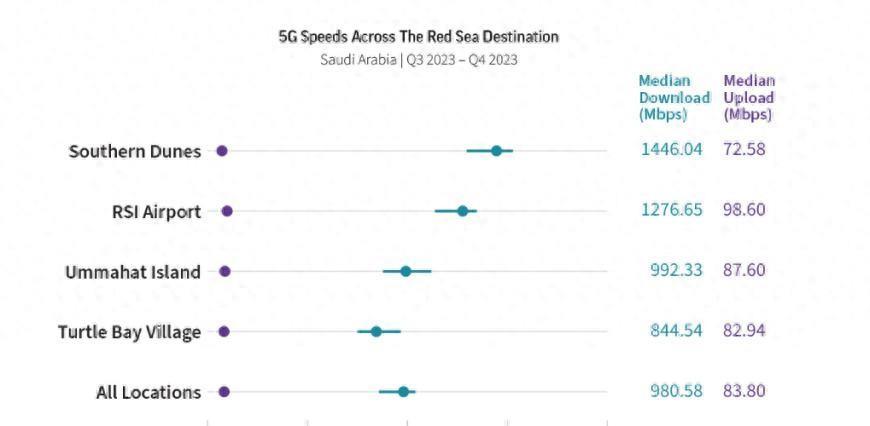 Ookla在2023年第三季度和第四季度对整个红海旅游区的网速的进行了测量。数据显示,红海国际机场的5G下载速度中位数为1276.65Mbps,是已有报告中网速最快的机场。瑞吉红海度假村和丽思卡尔顿度假区Nujuma所在的Ummahat群岛则达到了992.33 Mbps,也是已有报告中网速最快的岛屿地区。