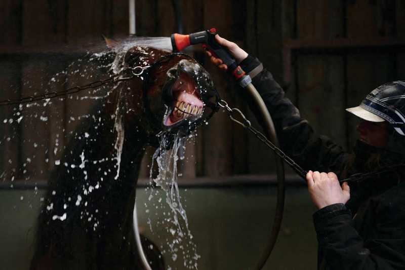 2024年2月19日,法国费尔菲涅尔,在Thierry Duvaldestin马厩里,饲养师为6岁的赛马“伊达·德·蒂拉德”洗澡。伊达·德·蒂拉德赢得了世界上最著名小跑比赛“美洲传奇大奖赛”和2024年文森法国大奖赛的冠军。被认为是世界上跑得最快的马,它以1分51秒3的成绩在1.3英里的赛程中轻松获胜,成为第13匹同时获得美洲奖和法国奖的小马