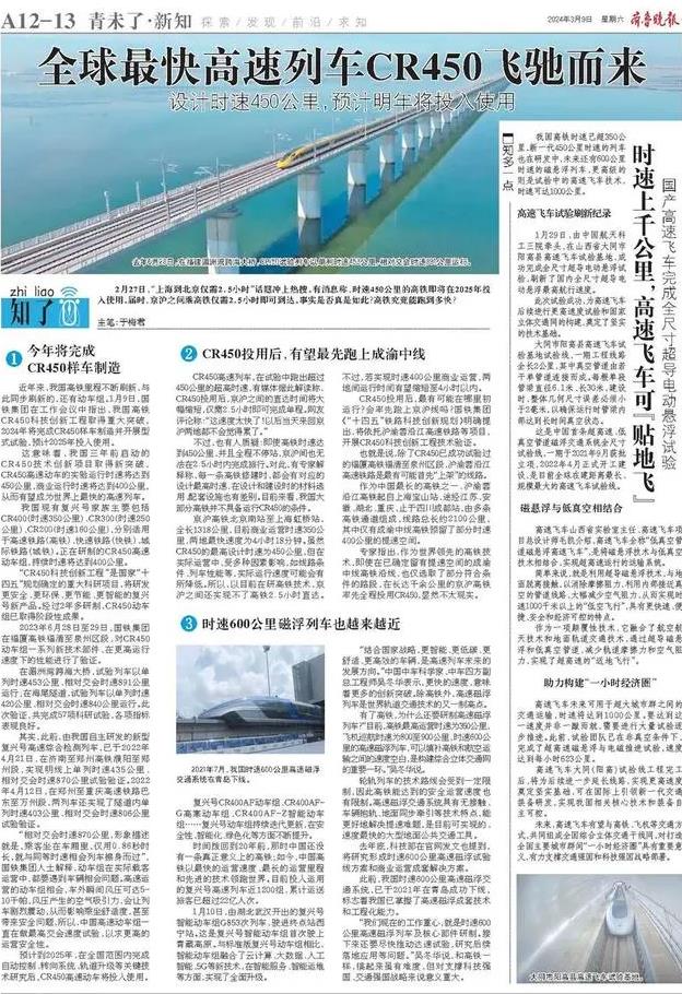 “全球最快高铁”,要来了! 被称作“全球最快高铁”的CR450动车组样车去年底公布后,目前正在不同速度、不同场景中进行多项试验。试验期间,CR450动车组跑出了动车组单列时速453公里、相对交会时速896公里的最新纪录。目前,CR450动车组正在沪 ... 世界最快10-21