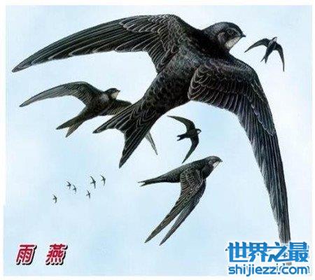 雨燕类属于中性的空中鸟,它们可以飞到距离地面一千米的高空上。但是因为飞的最快的鸟的食物都在距地面五十到一百米处的高空里,所以雨燕们会降低它们的飞行高度。它们会把多出来的食物储存在喉咙后面的一个特殊储物袋里,以备不时之需。