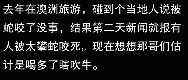 我同事表哥在澳洲打工,平时喜欢野外探险,有次遇到太攀蛇被咬了一口,当时还觉得没事,结果10分钟就倒地不起了,救护车赶到时人已经不行了,现在全家人都后悔让他去那么危险的地方工作