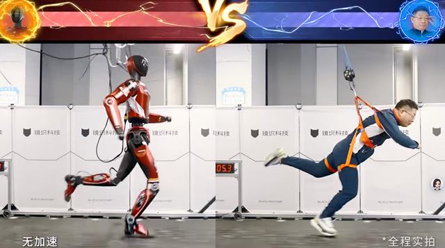 演示视频中,Blot与公司创始人王宏涛同时在特制跑步机上展开一场“人机赛跑”。最终,创始人因一个踉跄中断了奔跑,机器人却步伐稳健,且速度持续提升,记速器最终定格在10米/秒,意味着Blot百米冲刺只需10秒。