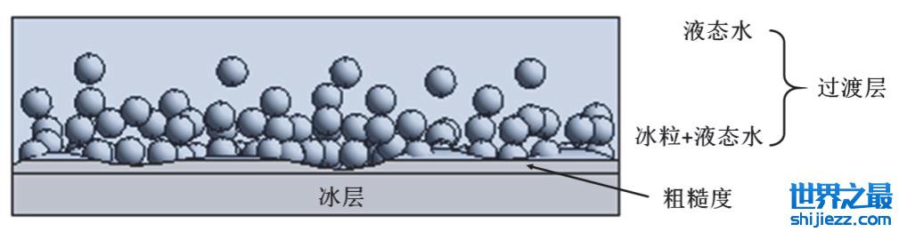 随着实验技术的发展,1960年以后,科学家们逐渐可以对冰面的微观结构进行足够精确的观察。温度不太低的时候,冰层与空气接触的表面并不是从规则排列的水分子突变成空气,而是存在一个过渡层。过渡层内部具有逐渐变化的结构,从分子排列整齐的晶态冰,到冰水混合物,再到完全的液态水膜。冰水混合物中的微型冰粒通过范德华力和氢键之类的弱作用力连结,形成了可以贮存液态水的多孔结构,就像凝胶珠一样。越靠近空气,过渡层中水分子的排列就越加无序,液态水就越多,固体冰晶之间的连结也越弱,甚至在水膜中出现了可以自由活动的微型冰碴和冰粒。