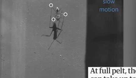 视频显示,这种蚂蚁可以在灼热沙子上疾驰,速度接近每秒1米,相当于一只家猫每小时以120英里(193千米)的速度狂奔。蚂蚁跑得越快,它们腾空而起的次数就越多,飞驰时它们六只脚一次性抬起。↓