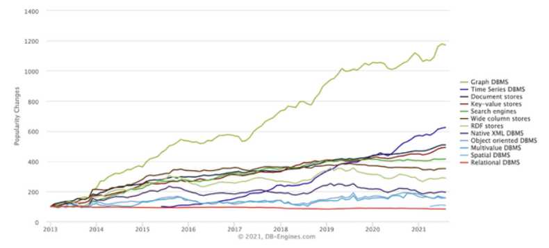 在数据库流行度排行榜网站 DB-Engines 上也可以看到,近 10 年来,人们对于图数据库的关注度,在过去十年内比其他的数据库都要高。