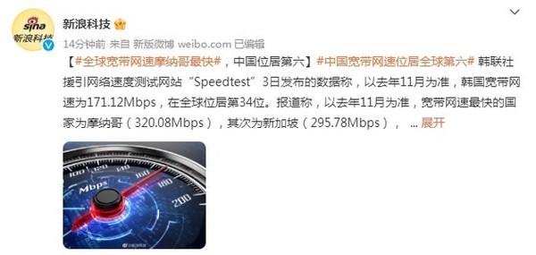 全球宽带网速排名:摩纳哥最快 中国第6 韩国排第34位