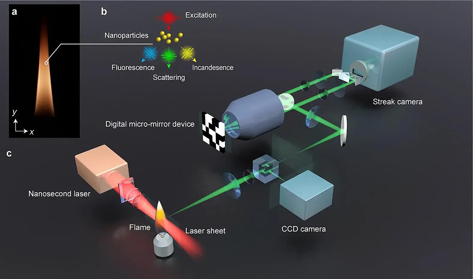 来自碳氢化合物的烟尘颗粒构成了星际空间中70%的物质,也是有趣的纳米材料,可应用于电子和能源领域。烟尘颗粒和芳香烃的寿命极短,当它们燃烧起来时,其寿命以纳秒计算。燃烧的特点是极快的反应且不会重复。研究燃烧需要超快的方法来捕捉图像,研究人员现在已经通过这种新的激光照相机实现了这一点。