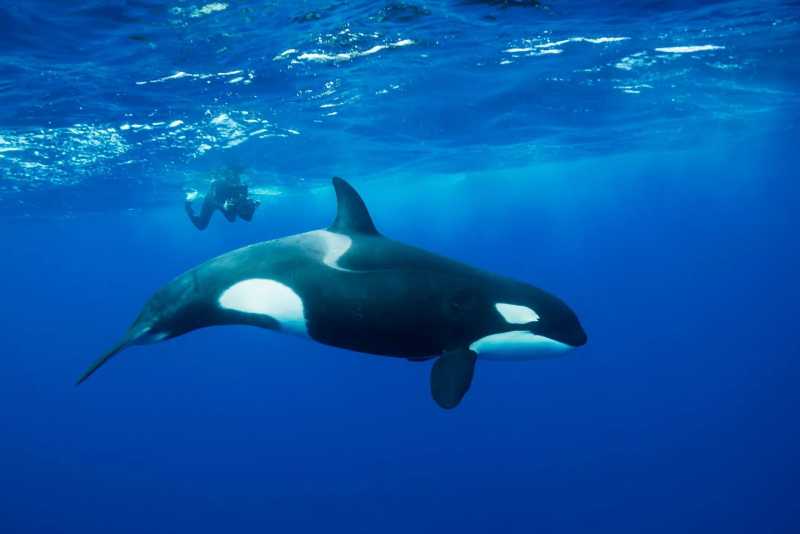 逆戟鲸的身体呈黑色,胸部和身体侧面部分为白色。雄性虎鲸重约6.5吨,身长6至8米。相对较小的雌性体长 5 至 7 米,体重约 3.3 至 4.4 吨。根据各种报告,它们的时速可达 55 公里/小时,这会因猎物和条件而异。