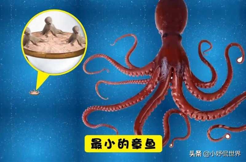 世界上最小的章鱼是沃菲章鱼,它不到2.5厘米,重量小于1克,它是在西太平洋相当浅的水域中被发现的。相比较之下,太平洋巨型章鱼则有6米长,50公斤重。