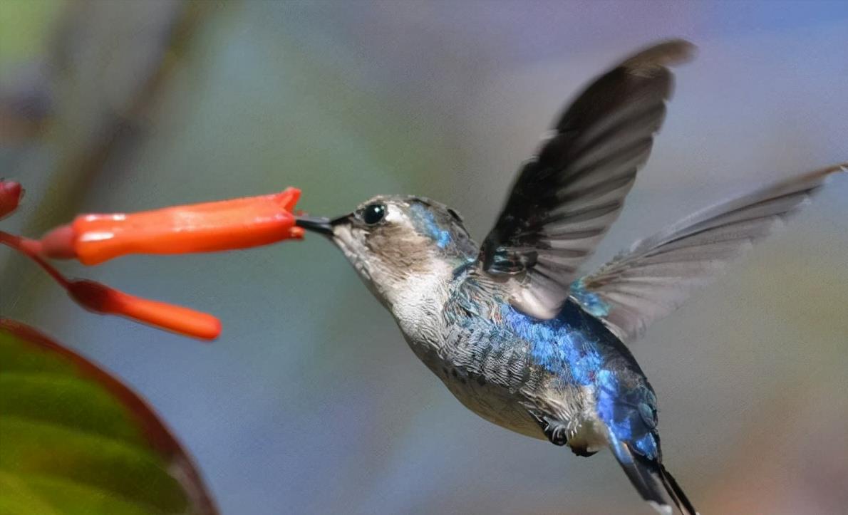 吸蜜蜂鸟,鸟如其名喜欢以花蜜和花朵为食,体长5.6~6.5厘米,重量2克,比硬币都要轻了。