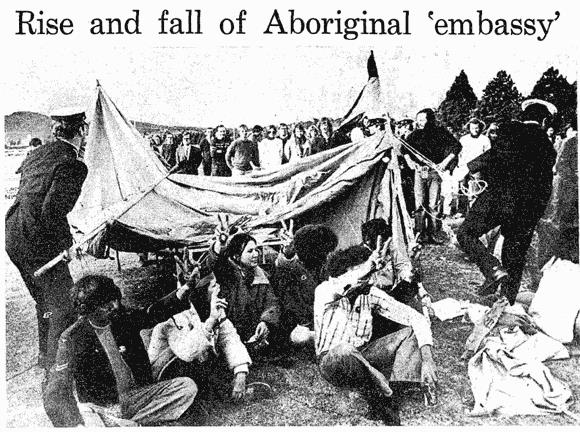 1972年,当时澳大利亚的总理麦克马洪发布了一项有关原住民土地使用的新政策,只给予原住民有条件的租赁权,而不承认他们的土地权或原住民所有权。四名原住民男子在国会大厦前的草坪上插上一把沙滩伞,宣布建立原住民大使馆。他们提出了一系列的要求,包括控制北领地、法律所有权和采矿权、保护所有神圣遗址、赔偿金和原住民委员会等。这项行动很快引起不少人响应,于是陆续有人带着帐篷前来支援,并有长期抗战的打算。这是帐篷大使馆的起源,此后持续有人来来去去的支援,帐篷大使馆数十年来历经无数次的拆毁与重搭不只是帐篷大使馆的保存问题而已,实际上澳大利亚原住民族的权利并未有太多突破性的改善。