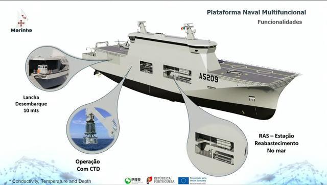 尽管在早期的宣传概念图中出现了MQ-9“收割者”的身影,但考虑到其超过20米的翼展和起降距离需求,即便有滑跃甲板辅助,在107米的平台上操作此类大型无人机仍显吃力。其核心航空战力将由葡萄牙国产的OGS42等中型固定翼无人机组成。此外,甲板后端具备起降葡萄牙空军AW101等重型直升机的能力,极大地增强了垂直补给和人员撤离效率。