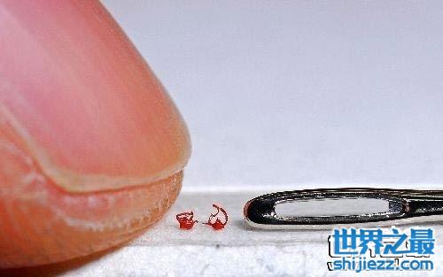 图为微雕大师陈逢显用红翡翠石粉末雕刻的世界最小茶壶。