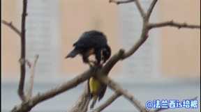 成年小隼全是吃肉的,食谱包括昆虫,蝴蝶、蜻蜓、蝉、甲虫,还有小型爬行动物、两栖动物,蜥蜴和青蛙,另外,小隼还会捉鸟吃。动图里是红腿小隼捉了一只金黄鹂,正在树梢上享用它的美食。