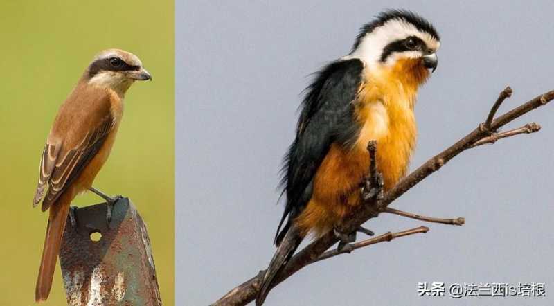 先来看它俩的共同点,首先,红腿小隼和伯劳的食谱重叠,它俩都能捕杀比自己个头更大的猎物。其次,小隼和伯劳停留在树枝上的姿势相似,它俩活泼好动,常在枝头摇头摆尾。第三,小隼和伯劳都有一条贯穿眼睛的黑色条纹,彰显捕猎者的身份。