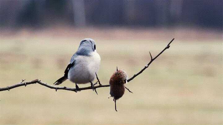 另外,没有铁爪的伯劳,在撕扯大型猎物时,只能借助外力。伯劳会把猎物,比如小鸟、青蛙、老鼠扎在荆棘刺,或者铁丝网上。伯劳用尖刺固定住猎物,然后再用嘴壳来撕扯猎物,把猎物分解成小块,方便吞食。