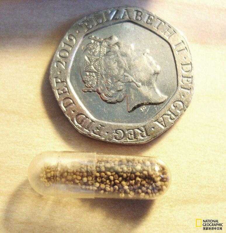 第二小的物种Angustopila coprologos的壳被装在明胶胶囊中,旁边是一枚英国 20 便士硬币,其直径与美国镍币的直径大致相同。摄影:ANDRÁS HUNYADI