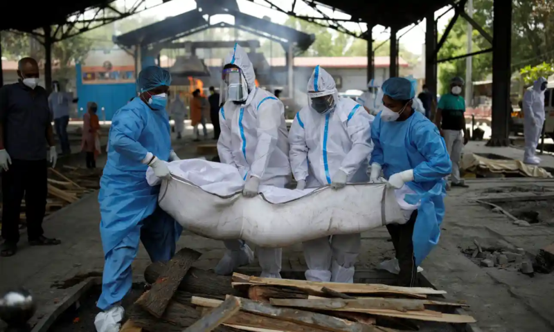 新德里的郊外,火葬场外很多家属在哭泣,装着亲人的裹尸袋放在人行道上,大家只能等着轮到自己。