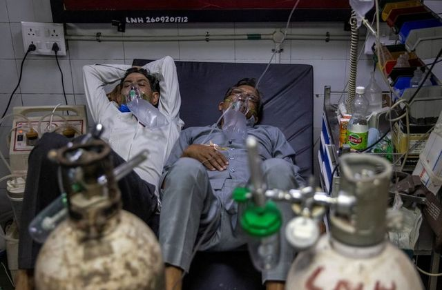 Lok Nayak政府医院内,很多新冠病人两个人躺在一张床上,而外面全都是等待床位的病人,在担架上和救护车内拼命呼吸的垂死者。