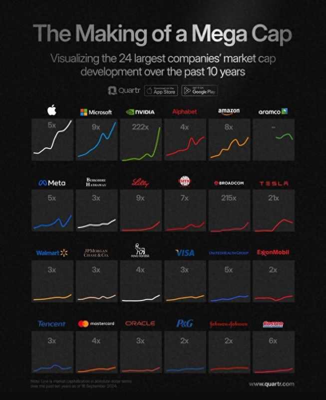 一图看懂:全球市值最高的24家公司 过去十年各自翻了几倍?