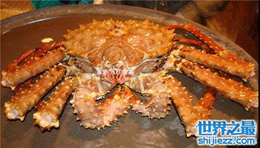 下面要说的世界上最重的螃蟹帝王蟹,它严格意义上来说,并不是属于螃蟹,因为它是属于石蟹科的甲壳类动物,但却长得非常像螃蟹,所以叫做帝王蟹,通过它的名字我们也可以得知,它拥有一个非常大的体积,在螃蟹中是帝王霸主的地位,而事实上确实如此,它因为体型巨大的闻名,在螃蟹中被称为螃蟹之帝王。