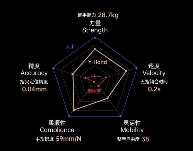 “应手Y-Hand M1”具有38个自由度及全手触觉感知, 在多个关键性能指标上,全面超越刚性灵巧手。