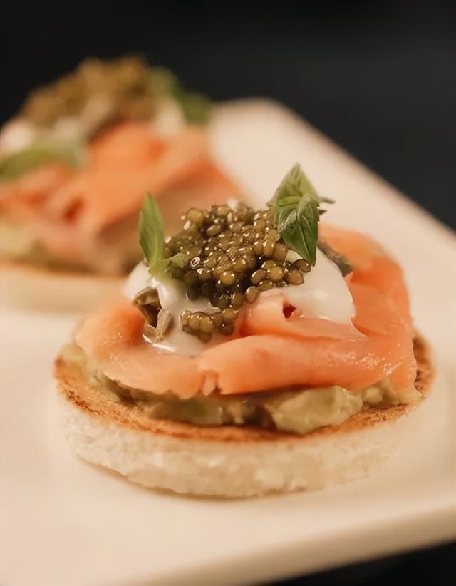 将面包片煎至金黄,然后取牛油果做成馅料均匀涂抹至面包片上,再放上三文鱼和奶酪,最后加一勺鱼子酱,即可出餐。