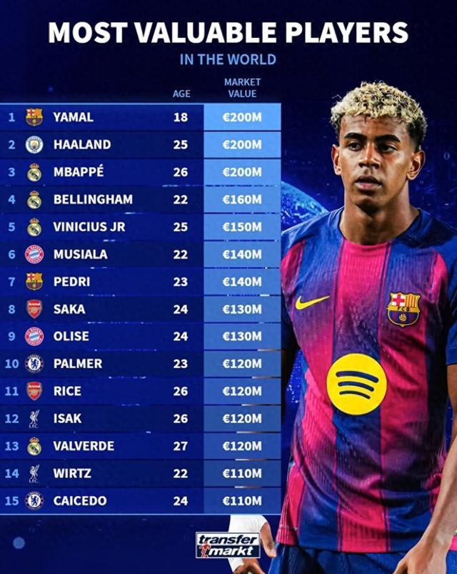 德转列世界足坛身价前15:亚马尔、哈兰德、姆巴佩2亿并列第一