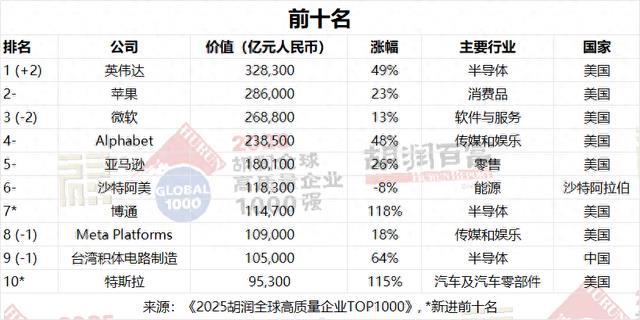 IT之家 12 月 16 日消息,胡润研究院今日发布《2025 胡润全球高质量企业 TOP1000》。得益于人工智能芯片和数据中心计算需求的激增,英伟达超越微软和苹果,成为全球价值最高的公司,价值 32.8 万亿元人民币,增长 49%。
