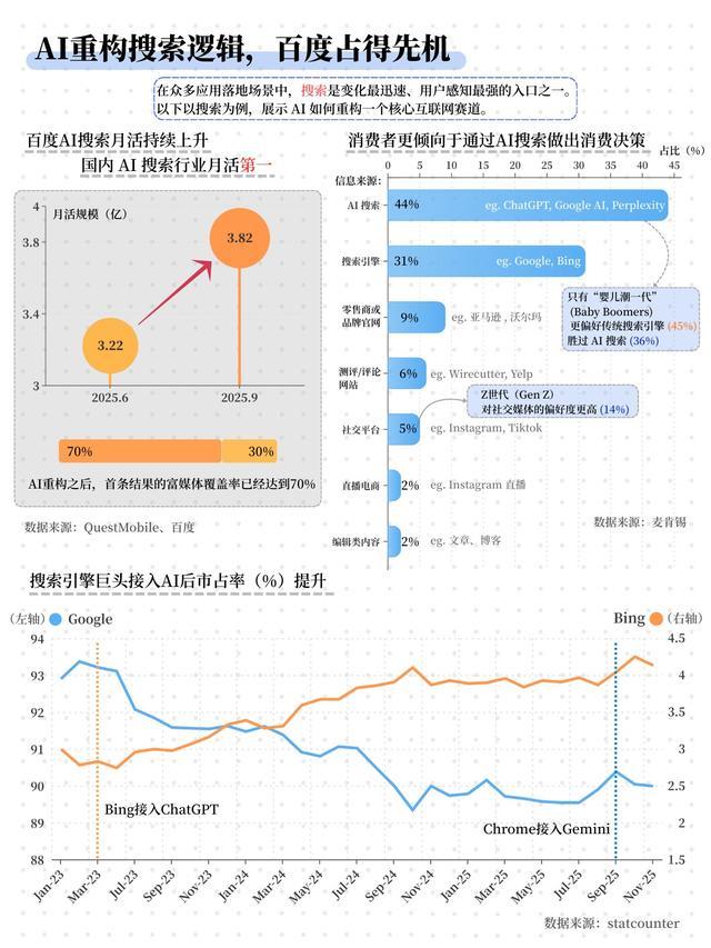 使用侧同样出现了罕见加速度。全球Token消耗在两年内增长近十倍;在中国,百度AI搜索月活达到3.82亿,首条结果的富媒体覆盖率已经达到70%。这意味着信息入口的主权开始从人转向模型,从输入式交互转向委托式代理。