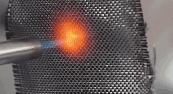 用喷枪进行火烧测试,碳纤维编织的布料中间已经被烧红,却没有冒烟,更不会被点燃,安全性能非常好。