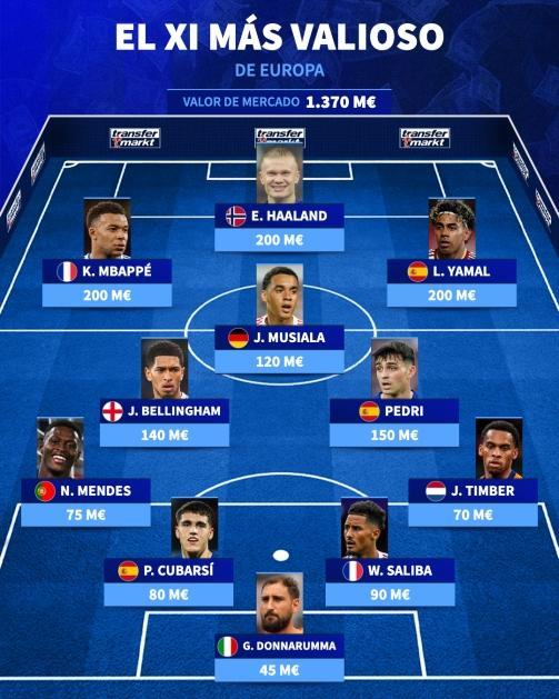 多纳鲁马(意大利,4500万)、门德斯(葡萄牙,7500万)、库巴西(西班牙,8000万)、萨利巴(法国,9000万)、廷伯(荷兰,7000万)、贝林厄姆(英格兰,1.4亿)、佩德里(西班牙,1.5亿)、穆西亚拉(德国,1.2亿)、姆巴佩(法国,2亿)、亚马尔(西班牙,2亿)、哈兰德(挪威,2亿)