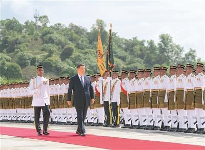 习近平乘车抵达时,易卜拉欣和马来西亚总理安瓦尔在下车处热情迎接。两国元首登上检阅台,军乐团奏中马两国国歌,鸣礼炮21响。习近平检阅仪仗队。两国元首进入国家王宫大厅,同双方陪同人员握手致意。