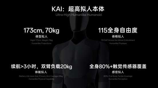 承载这些先进能力的,是名为“KaiBot”的高拟人机器人本体。KaiBot身高173厘米、体重70公斤、头身比1:8.5,整体体型和质量分配接近成年人类。